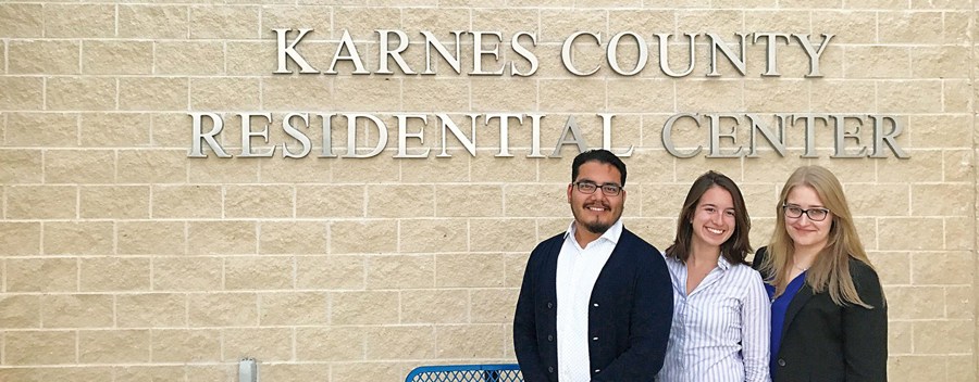 As part of this effort, students from the Law School asked the detainees questions—in English and Spanish—to tease out details that might be helpful to their applications for asylum. The students said the experience was “intense” and “fast-paced,” as well as a great introduction to the value of client services in immigration law. España and Kaznowski hope to return to the Karnes Center with an even larger group of students this summer.