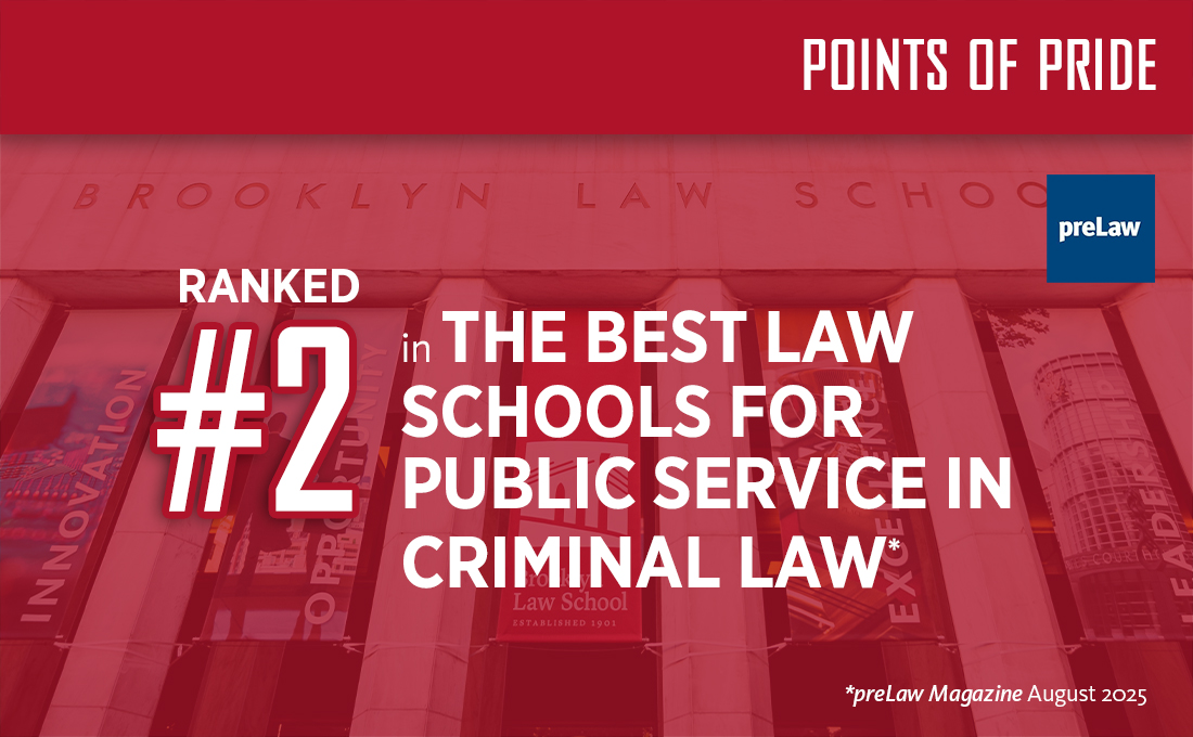 A national ranking of “The Best Law Schools for Public Service” that was published in preLaw magazine has placed Brooklyn Law School at No. 2 in the criminal law category an honor that is based upon its strong curricula and high levels of employment in the field.