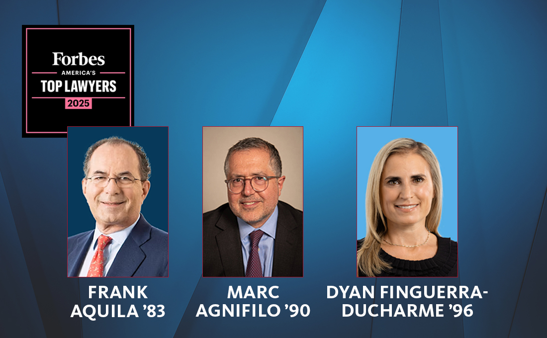 Brooklyn Law School is proud to celebrate three distinguished alumni who have been named to Forbes’ 2025 list of America’s Top 250 Lawyers: Frank Aquila ’83, Marc Agnifilo ’90, and Dyan Finguerra-DuCharme ’96. The annual list recognizes attorneys who exemplify excellence, innovation, and leadership across the profession.